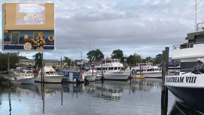 Although Superstorm Sandy hit Freeport's Nautical Mile hard in 2012, most businesses there have rebounded. (Inset) Kathleen Fallon, New York Sea Grant's Marine Coastal Processes and Hazards Specialist, welcomes the audience in Freeport at a late-September hurricane forum on forecasting, communication and preparedness. Credit: Ryan Strother.