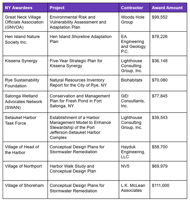 This year’s 14 awarded projects—nine in NY and five in CT—include community resilience plans, shoreline adaptation plans, strategic plans, natural resource inventories, watershed management plans, and development of stormwater remediation strategies and conceptual design plans. Find more details below and view the full Award Slate at: