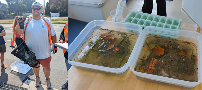 Participants at the CASCADE Curriculum Workshop in Rochester, NY who toured LittaTraps in city storm drains were joined by (at left) Jake Anderson, NYSG's Water Quality Extension Specialist, and (at right) examined the contents of those LittaTraps in the lab. Credit: Nate Drag/NYSG