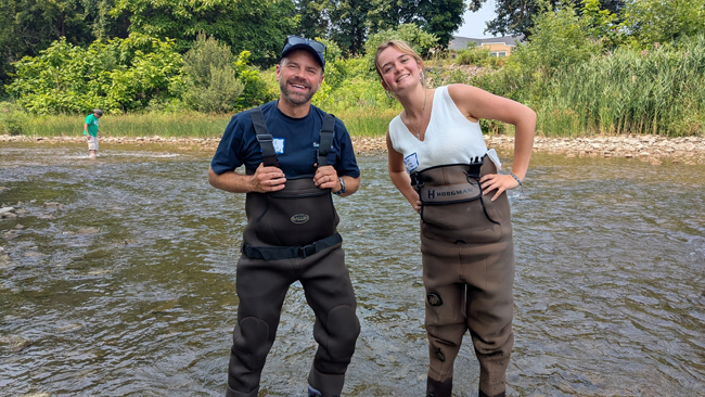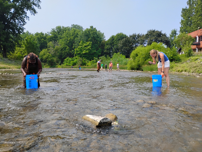 At GLEEE Workshop on August 4th, (l-r) NYSG Great Lakes Literary Specialist Nate Drag and University of Buffalo researcher Isabel Porto-Hannes led participants in a streamside mussel survey, which is used to help determine how many mussels are present in our waterways. Credit: Nate Drag/NYSG