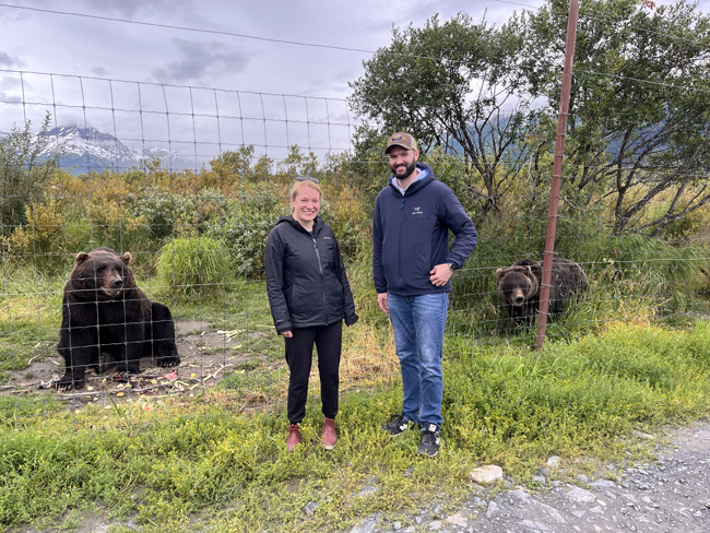Alyson Lowell (left) and her mentor Matthew Robinson (right) pose in front of grizzly bears at the Alaska Wildlife Conservation Center. Credit: Alyson Lowell