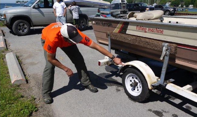 Watercraft inspection engages boaters in learning how they can help slow and stop the spread of aquatic invasive species by checking their boats and trailers for debris that may contain AIS. Credit: New York Sea Grant