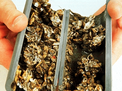 Zebra and quagga mussels biofouler such solid underwater substrate as rocks, piers, intake pipes, and boat hulls by attaching with using tough elastic strands called byssal threads. In addition to the ecological damage caused by zebra and quagga mussels, hundreds of millions of dollars have been spent to clean up fouled pipes and keep the mussels from fouling drinking water treatment, industrial and power plant intakes. The mussels have spread beyond the Great Lakes into 22 states and 2 Canadian Provinces (pdf).