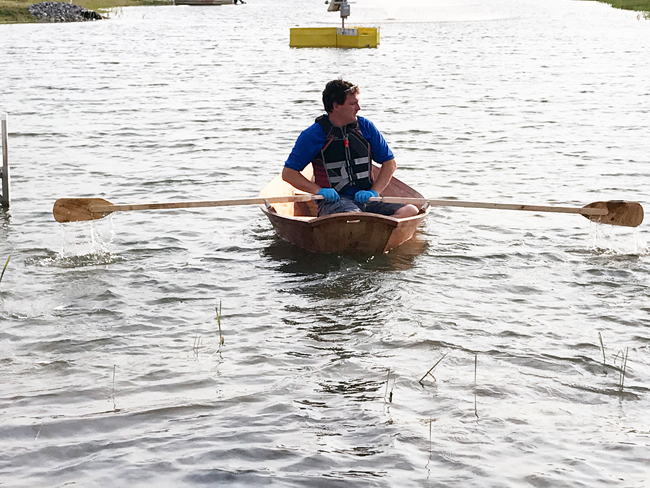 Richard Bush rows the dory he built at the Great New York State Fair on the Fair pond on Labor Day 2017. In 2018, the winner of the Name The Boat Contest will win that dory. Entries may be submitted at the new Maritime History exhibit at the Fair. Photo: New York Sea Grant.