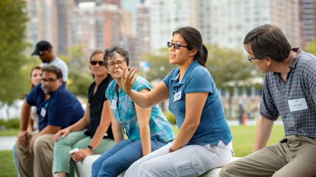 The workshop included a full-day visit to Cornell Tech, where teachers toured the sustainably designed campus and practiced a Sea Level Rise field activity using simple surveying tools, setting transects to visualize predicted SLR over time.  The field activity is included in a set of lesson plans NYSG developed with the New York State Department of Environmental Conservation's Hudson River Estuary Program.