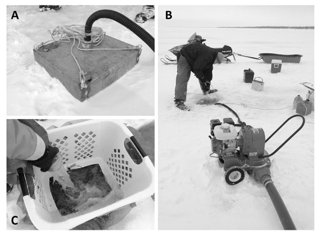 A researcher samples cisco eggs in Chaumont Bay, Lake Ontario, using a diaphragm pump. Credit: Ellen George