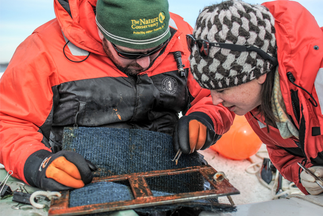 Brian Roat (The Nature Conservancy of New York, left) and Ellen George (Cornell University, right) look for eggs on an egg mat in Sandy Pond, Lake Ontario. Credit: Mat Levine