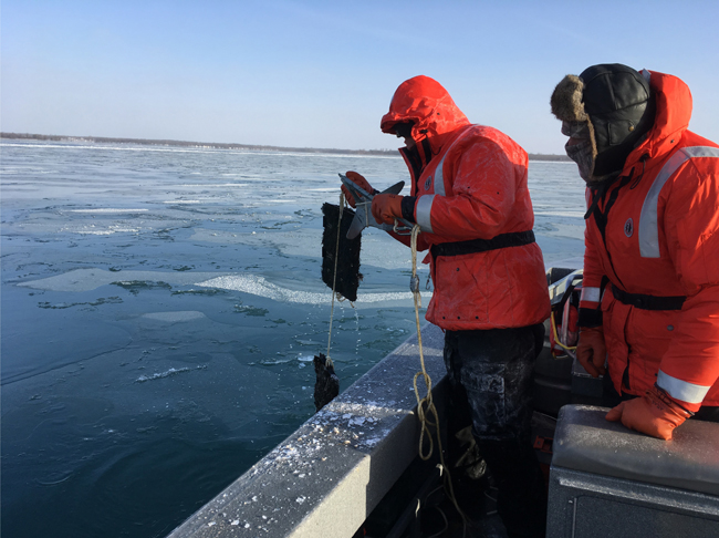 USFWS biologists Eric Bruestle (left) and Curt Karboski (right) retrieve egg mats on a cold (3°F) day near Grenadier Island, Lake Ontario. Credit: Ellen George