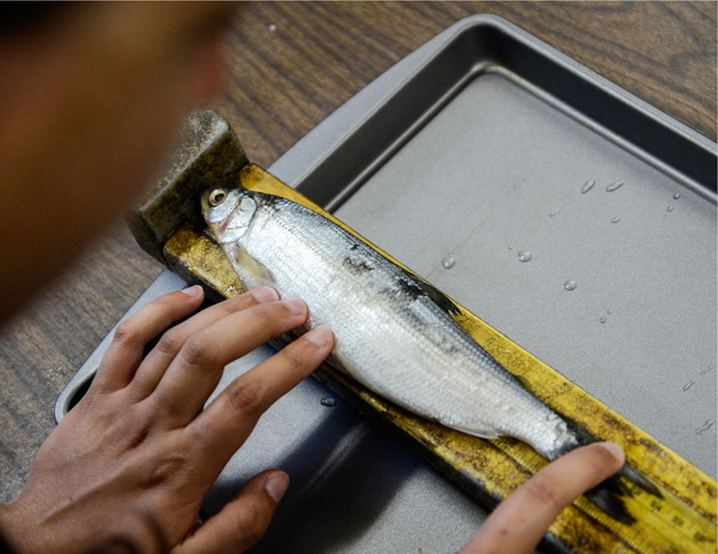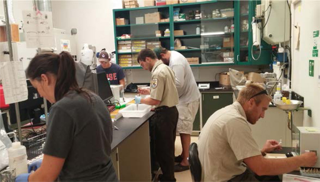 Scientists in the lab take genetic samples from over 300 captured cisco. Credit: Brian Weidel, United States Geological Survey, Lake Ontario Biological Station