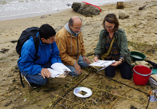 One of 2019’s Mentor Teachers, Hildur Palsdottir (far right), doing a plot activity with workshop attendees to study microplastics at the beach in Sands Point, NY. The workshop was lead by Palsdottir and fellow Mentor Teacher Leah Master (not pictured), who gave hands-on lessons on coastal erosion. Credit: Jimena Beatriz Perez-Viscasillas/LISS