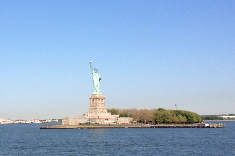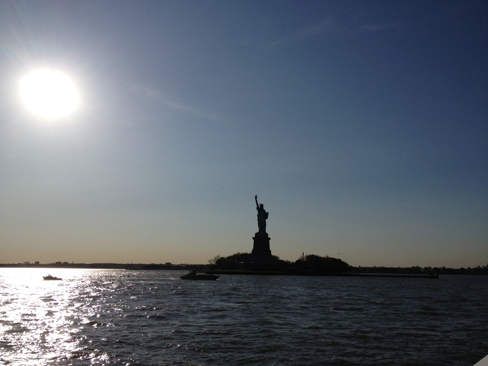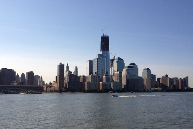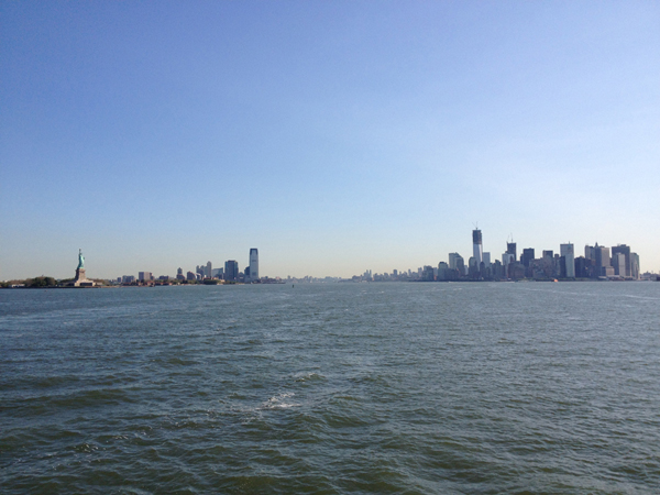 Heading further out in New York Harbor, the City's giants shrinking toward the horizon line.