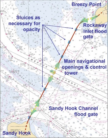 The concept leaves room for three major openings in the causeway to let ships and barges through -- one near the Sandy Hook, one near the Rockaways and one over the Ambrose Channel. The Sandy Hook and Rockaways openings would have 300-foot wide lifting gates, flat, solid barriers that would sink into the bay floor to let ships through, but could be raised in the event of a storm. Over the Ambrose Channel are a pair of radius axis sector gates, two pairs of curved gates that swing inwards to protect against flooding.