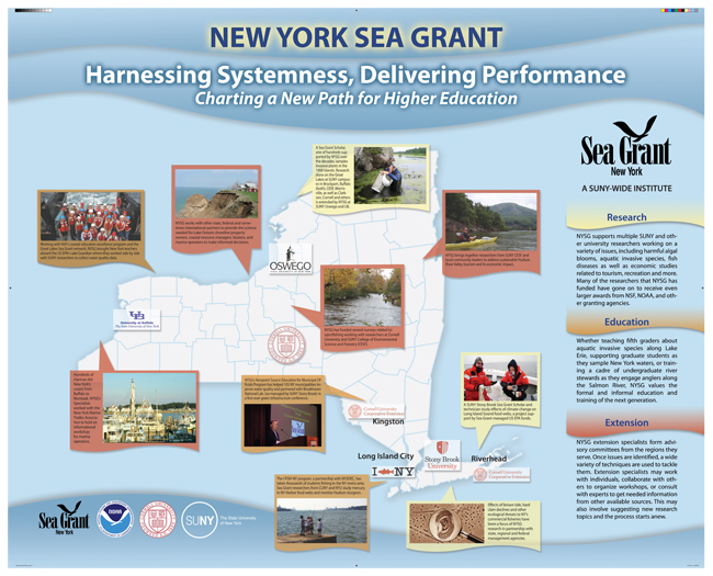 For the second annual Critical Issues in Higher Education Conference sponsored by the State University of New York (SUNY) in November 2012, New York Sea Grant was invited to present a poster that shows how NYSG exhibits “systemness” by interacting with other campuses in the SUNY system.  The conference entitled Harnessing Systemness, Delivering Performance, aimed to explore new models for building and rebuilding higher education to meet the economic and political challenges ahead.