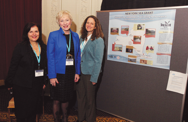 At the November conference in New York City,  New York Sea Grant Associate Director Dr. Kathy Bunting-Howarth (right) and NYSG Communications Manager Barbara Branca (left) explain a poster to SUNY Chancellor Nancy Zimpher that shows how NYSG brings researchers and coastal educators together from many SUNY campuses. (Photos courtesy SUNY)