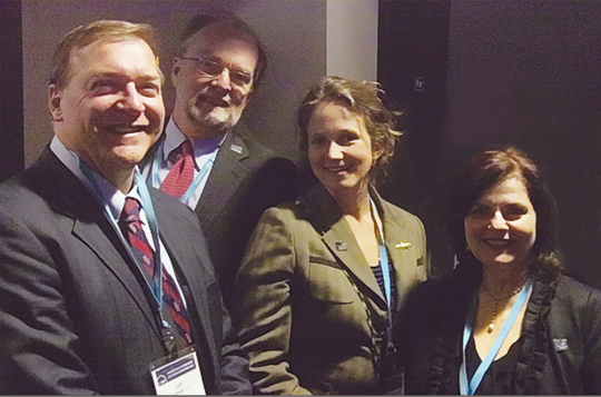 Dr. Samuel Stanley, President of Stony Brook University (left) at the 2012 SUNY Systemness Conference with (l to r) Dr. Jim Ammerman, NYSG Director; Dr. Kathy Bunting-Howarth, NYSG Associate Director; and Barbara A. Branca, NYSG Communications Manager.