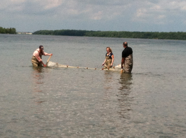 Seine nets (like the one seen above) are usually long flat, weighted nets that hang vertically in the water and are used to encircle, and safely collect, fish for study. The fish are then placed into buckets filled with lake or river water and then scooped up for a brief period of study (as seen below) before being placed back into the body of water they came from. Photos: Helen Domske, NYSG