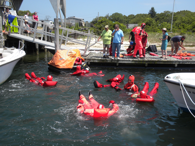 At the Safety at Sea training event in Inlet Seafood in Montauk, NY, commercial fishermen, boaters and others who work on the water learn how to don immersion suits. Credit: Paul C. Focazio / NYSG
