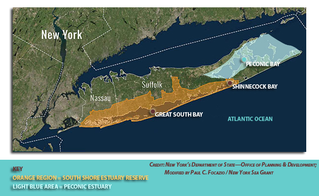 The Peconic Estuary system (denoted within the light blue area) is located between the North and South Forks on eastern Long Island. The estuary includes more than 100 distinct bays, harbors, embayments and tributaries, including Flanders Bay, Great Peconic Bay, Little Peconic Bay, Noyac Bay, Shelter Island Sound and Gardiners Bay. Excess inputs of nitrogen have caused an imbalance in the estuary, which results in recurrent algae blooms and related drops in dissolved oxygen during the summer. This excess nitrogen is also suspected of contributing to a decline in eelgrass beds.