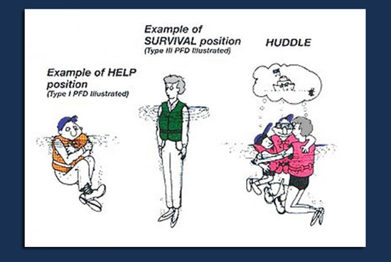 For a Type 1 PFD, the HELP position is crossed ankles, legs drawn together and up to chest, and crossed arms across your chest. For a Type 3 PFD, draw your legs together tightly and keep your arms tight to your sides. Huddle together with a buddy or others in a group.