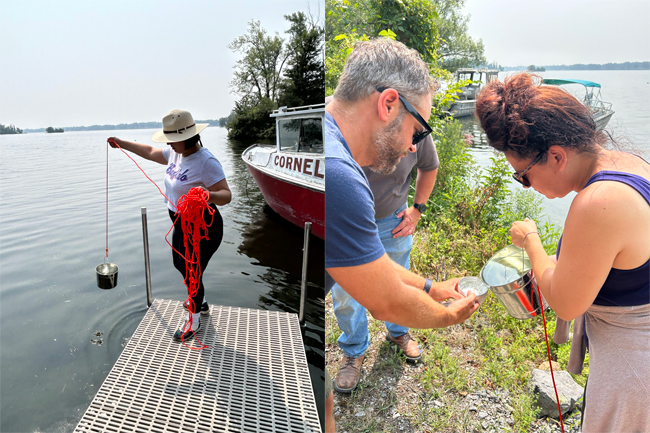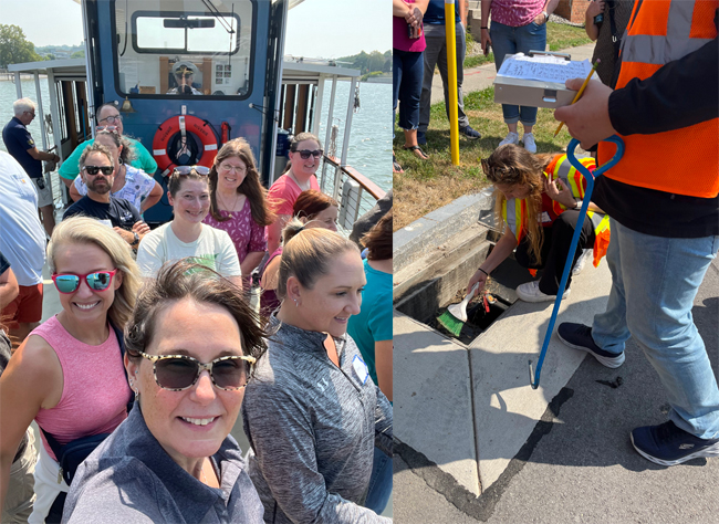 Educators at this summer 2025 workshop, held on August 14th at the Rochester Institute of Technology and along the Genesee River, (at left) toured LittaTraps in city storm drains, visited the lab, and (at right) headed out on a boat to explore plastic pollution solutions. Credit: Nate Drag/NYSG