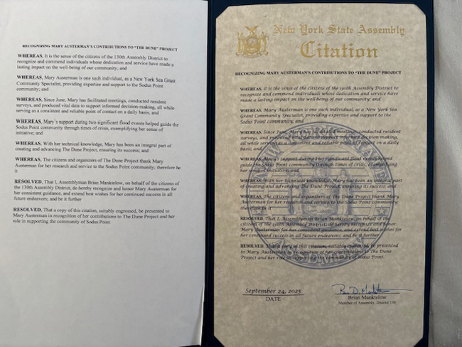 The Citation from Assemblyman Manktelow recognizes Austerman for her technical expertise and steadfast leadership in advancing “The Dune Project.” The honor commends Austerman for her dedication and consistent, reliable presence supporting the Sodus Point community through daily collaboration and informed coastal resilience planning.