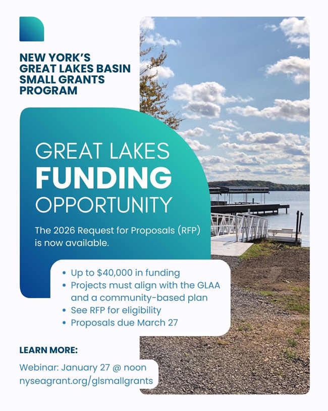 • Interested applicants are encouraged to join New York Sea Grant’s informational webinar on January 27, 2026, at 12 p.m. to learn more about the project requirements and application process. Register with New York Sea Grant at nyseagrant.org/glsmallgrants.
