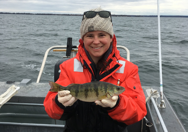 SUNY Oswego Assistant Professor Ellen Karboski, Ph.D., will highlight a collaboration with a local fish processor in support of fisheries’ research programs for students a part of the 2026 Upstate Seafood Summit on April 9th in Oswego, New York. She is seen here with a yellow perch collected from Chaumont Bay. Credit: Ellen Karboski
