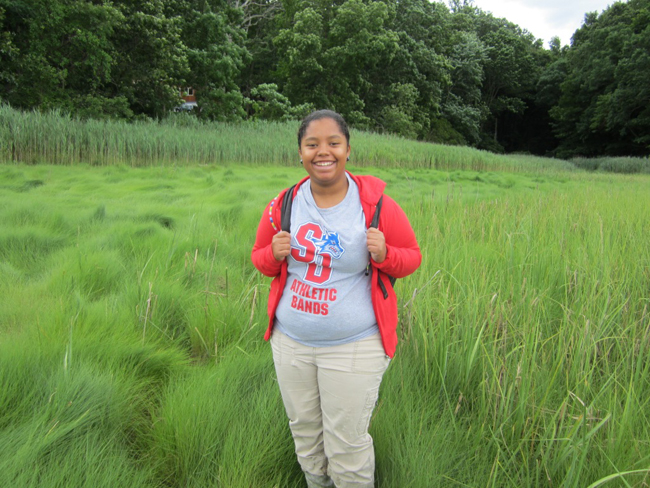 IMG_0291 Former Stony Brook University undergraduate Ashley Moreno at East Creek (Sands Point, NY). Ashley is standing at the transition between Spartina alterniflora (taller grass) and Spartina patens (short, high-marsh grass). You can also see invasive Phragmites australis in the background of this photo.