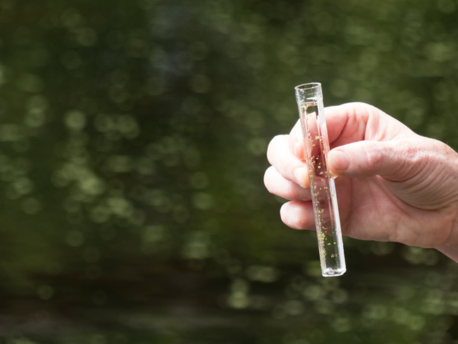 Phosphorus, a nutrient responsible for plant and algae growth, was once a common ingredient in dish soaps and detergents and can still be found in some household products, as simulated in this water sample. Credit: Ryan Strother/NYSG.