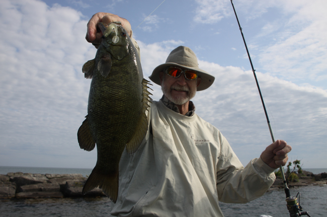 Dave Barus of East Aurora hoists of a big smallmouth bass out of Lake Erie last spring while fishing out of Dunkirk. Credit: Buffalo News.