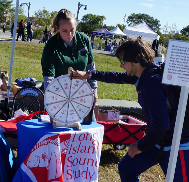 A Oyster Fest attendee spins the "Long Island Sound trivia" wheel. Credit: Michael Ciaramella, Jimena Beatriz Perez-Viscasillas/NYSG.