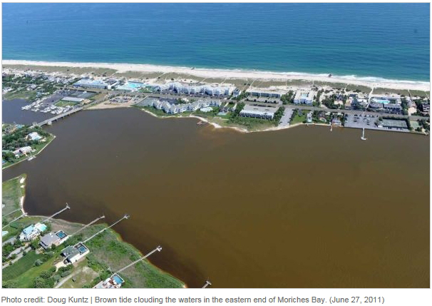 Brown tide has clouded normally clear waters from western Shinnecock Bay to eastern Moriches Bay, with the highest concentrations found off Quogue, in Quantuck Bay. Water samples taken from the affected bays showed cell concentrations are well above