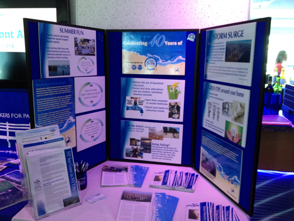 New York, NY, May 23, 2012 - New York Sea Grant was well represented at this year's Metropolitan Waterfront Alliance, held on May 18-19 at Chelsea Piers and other points along the Hudson River. Friday's full-day of plenary and panel sessions was bookmarked by cruises along the River. Towards the evening hours, attendees got aboard the Hornblower Hybrid, the nation’s first vessel powered by diesel, hydrogen, batteries, wind and solar energy. This is where NYSG's display was set up by Web Content Manager Paul C. Focazio.