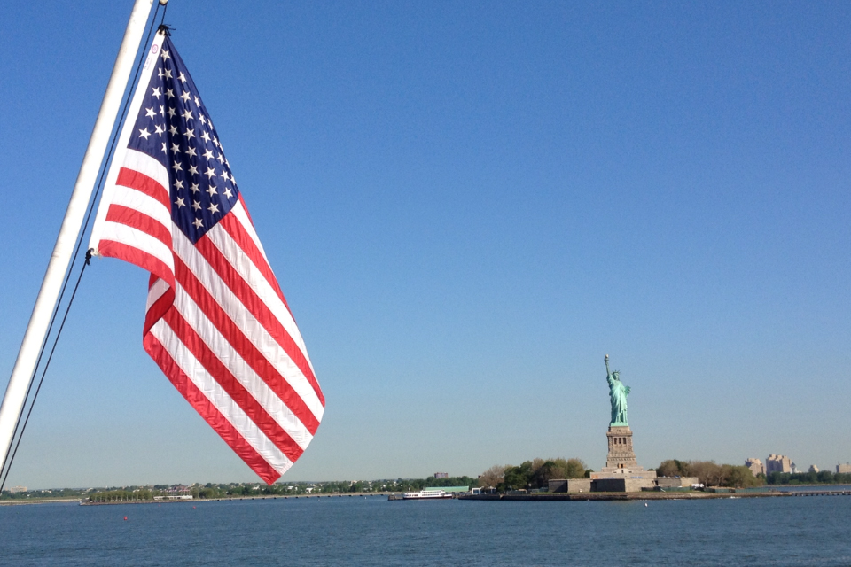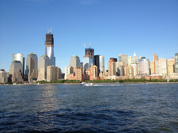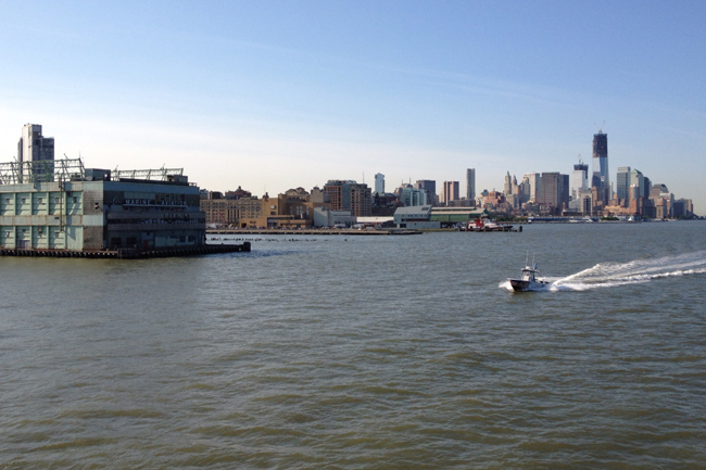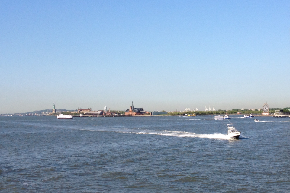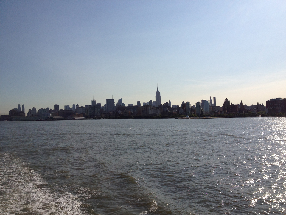 Heading further out in New York Harbor, the City's giants shrinking toward the horizon line.