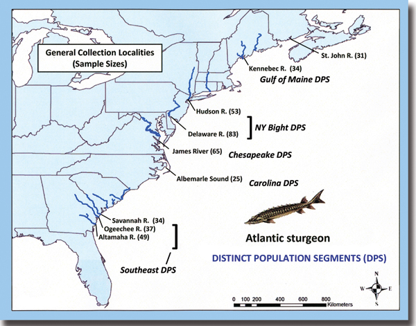 The agencies that manage fisheries are concerned about preserving and restoring critical species. But to do this, they must first identify the distinct population segments or DPS of each species. Then managers can take into account any unique regional populations and preserve as much as possible natural genetic structure of each species in management and/or restoration plans. In the case of sturgeon, the DPS corresponds to the individual or combinations of estuaries along the eastern seaboard.