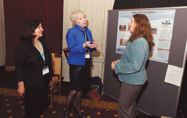 At the November conference in New York City,  New York Sea Grant Associate Director Dr. Kathy Bunting-Howarth (right) and NYSG Communications Manager Barbara Branca (left) explain a poster to SUNY Chancellor Nancy Zimpher that shows how NYSG brings researchers and coastal educators together from many SUNY campuses. (Photos courtesy SUNY)