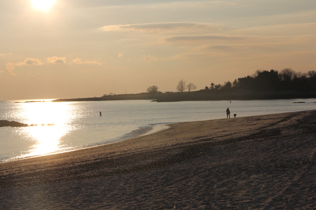 A woman and her dog enjoy views of Long Island Sound at Waterford Town Beach, CT before sunset on Jan. 13, 2021. Credit: Judy Benson / Connecticut Sea Grant