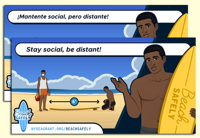 The nine bilingual (available in English and Spanish) illustrated messages, created by freelance designer Joel Davenport, not only focused on standard “ocean hazards” tips such as “Break the Grip of the Rip,” but also incorporated general safety and health concerns related to COVID-19.  Other messages included: "Stay social, be distant"; "Don’t let your mask become marine debris!"; “Stay dry when waves are high”; and "Grab your sunscreen and sanitizer," among others.