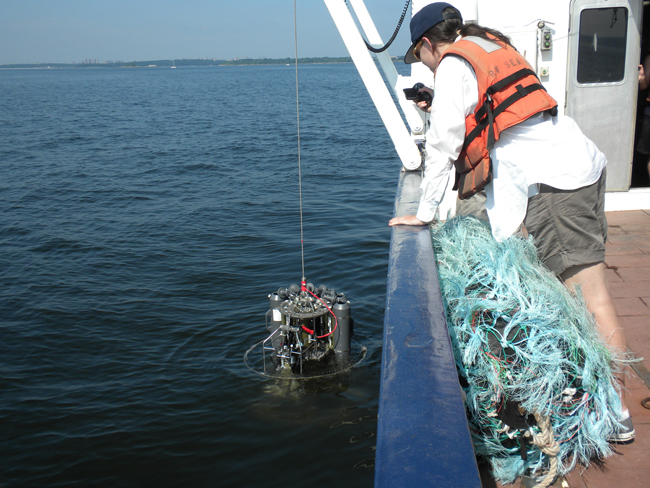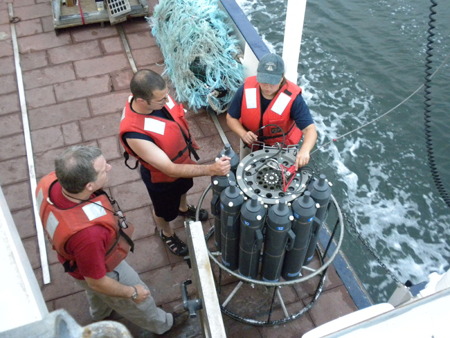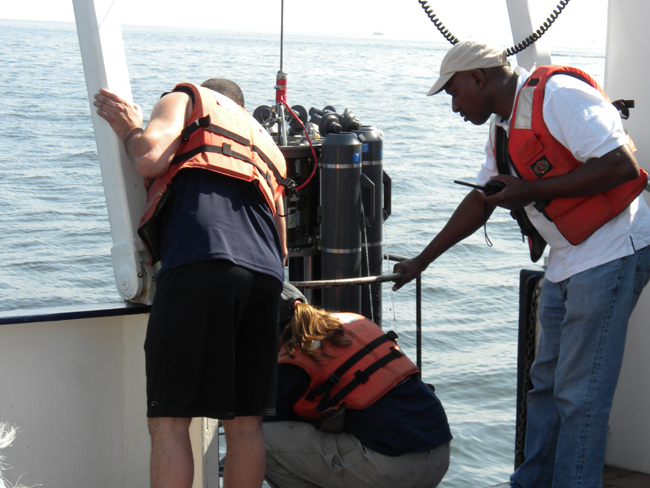 NYSG-funded researcher Kamazima M. Lwiza (at far right) leads others on this investigative team during a water sampling session using a rosette, which (as seen above and below) is being lowered into Long Island Sound.