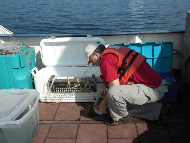 Here, Gordon Taylor is setting up the respirometer. It is an instrument that he designed and built with Tom Wilson. There are several channels with tubing connected to bags with seawater in them. The samples are incubated in the cooler at ambient temperatures. The respirometer draws sample from each bag  every few minutes and draws it past an oxygen electrode. The oxygen concentration is measured and recorded electronically. In this way, the team was able to measure the drawdown of oxygen over a two or three-day period and calculate the rate of respiration for different samples.