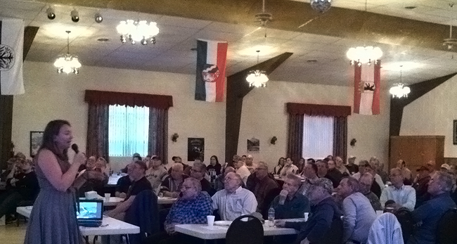 One of the featured speakers invited by Domske, Dr. Sherri A. Mason (pictured above, presenting at the meeting), an Associate Professor of Chemistry and Environmental Sciences Program Coordinator at SUNY Fredonia, presented on microplastics in Lake Erie and their impacts on fish health. Mason’s “Great Lakes Plastic Pollution Survey” studies key on all the plastics found in waters, and 80 percent consist not of plastic sheeting or bottles but of small fibers, particles and pellets that enter waterways from washing synthetic clothing, a problem experts need to address.