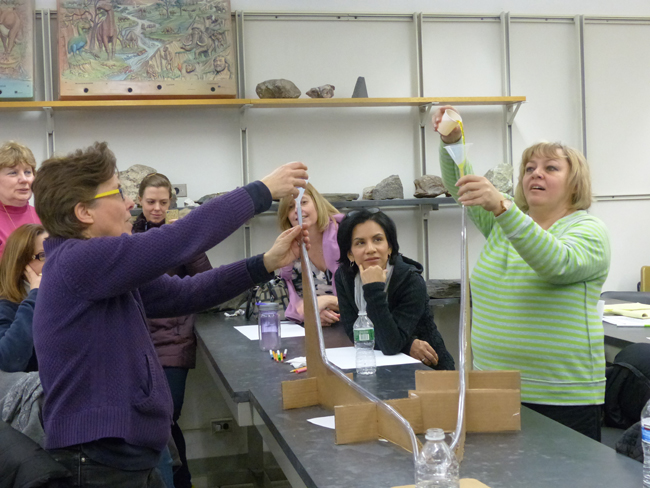 In addition to all the coastal map learning, the educators also tried out several interactive classroom-friendly activities, including the one pictured above: a watershed model mimicking the slope of the Hudson River and its tributaries. The teachers poured different fluids down the tubes—blue-colored water (freshwater) and yellow-colored water (saltwater)—to illustrate how both mix to form the estuarine waters of the Hudson. Photo: David Jakim