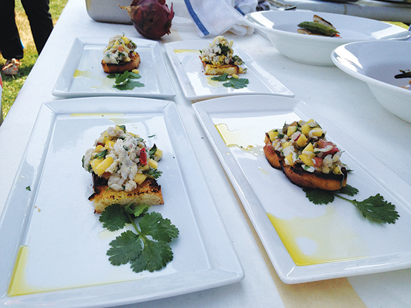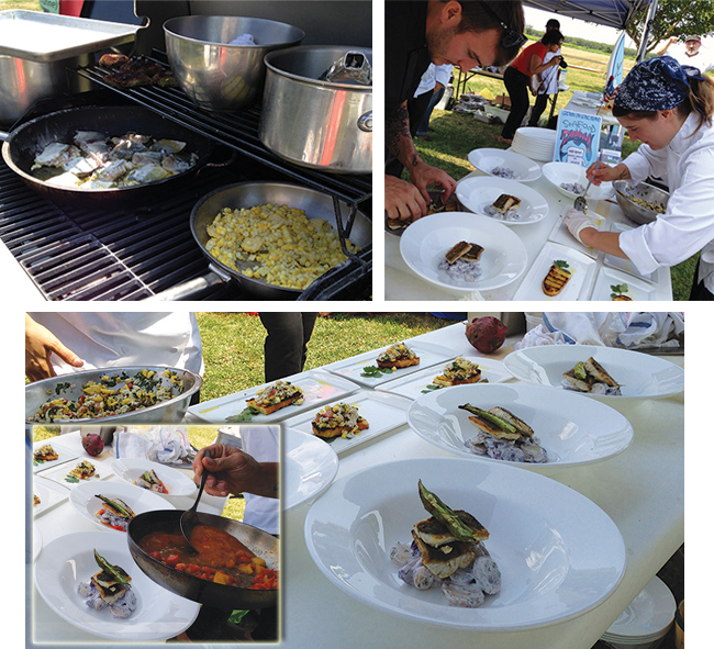 The chefs were tasked with creating their dishes using ‘red hot and blue’ mystery ingredients: sparkling fresh local bluefish and a variety of heirloom tomatoes. Once again, Phil Karlin of PE & DD Seafood’s Little Fish Shop in Riverhead donated the freshest seafood. Cornell Cooperative’s agriculture expert Sandy R. Menasha explained to the growing audience the variety of the summer’s bounty of tomatoes. Patrick Iacono, Assistant Facilities Program Coordinator of the Calverton Business Incubator was on hand to let people know about how the Incubator has helped local businesses grow and thrive—including that of Chef Amaral.