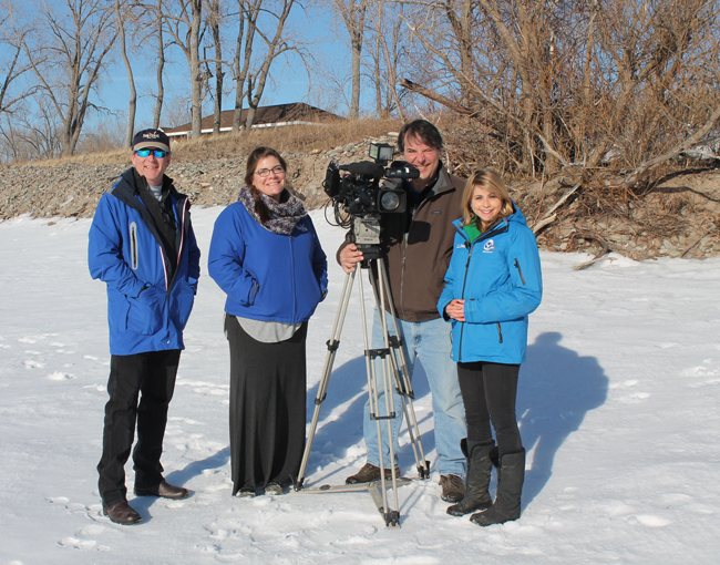 PHOTO: New York Sea Grant Recreation and Tourism Specialist Dave White captures a photo as New York Sea Grant Coastal Community Development Specialist Mary Penney is interviewed by News Channel 9 Reporter Rachel Polansky and Photojournalist Bill Goldschmidt. The background shows frozen ice dunes along the eastern Lake Ontario shoreline. Photo: Kara Lynn Dunn