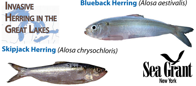A brochure from New York Sea Grant (first released in May 2015) (pdf) explores a key question tying these fish species together: Since their introductions at opposite ends of the Great Lakes, are populations of Skipjack and Blueback Herring expanding?