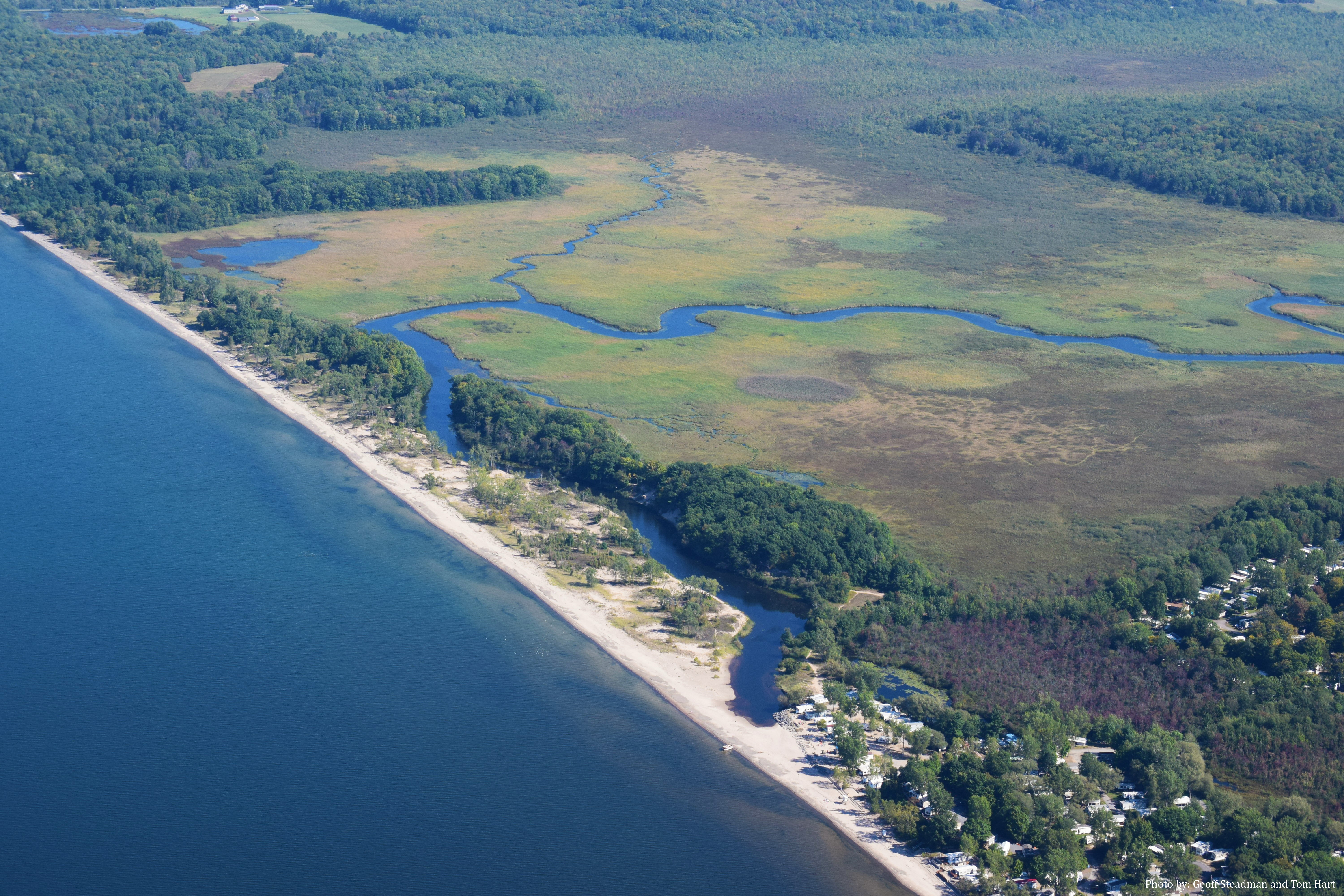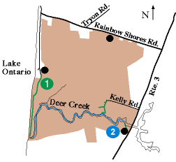 Route description: Deer Creek meanders through cattail marshes, past wood duck nesting boxes and muskrat and beaver lodges, and, near its Lake Ontario outlet, between the fore and secondary dunes along the coast. This is one of the most scenic boat routes in the area. Please land your boat only at the outlet to prevent erosion of the dunes along the creek.