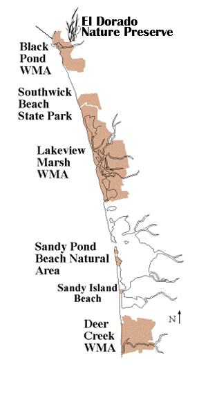 Continue south on the path to the high dune overlook. From this overlook you can view the dunes of Black Pond Wildlife Management Area, the tallest dunes in the northeastern U.S. outside of Cape Cod. At this point you can either continue across the outlet and follow the beach to Black Pond WMA or follow the trail behind you back to the El Dorado parking area. If you decide to cross the Black Pond outlet, a string fenced trail may be present. If so, please stay within the string fencing to reach Black Pond WMA. A word of warning: Currents in the outlet can be dangerous!
